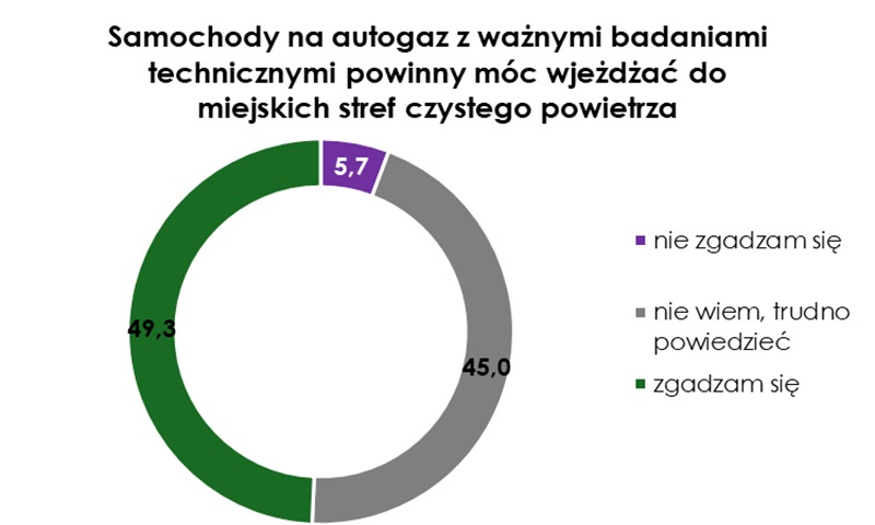 Wobec trwającej dyskusji o Strefach Czystego Transportu (SCT), zadano Polakom pytanie, czy ich zdaniem zasilane LPG samochody z ważnymi badaniami technicznymi powinny móc wjeżdżać do takich stref. Aż 49,3% respondentów udzieliło odpowiedzi pozytywnej, a 5,7% – negatywnej.
