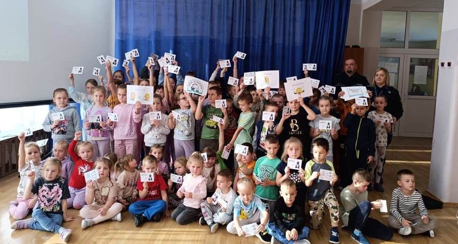 Funkcjonariusze przekazali drobne upominki dla uczniów, którzy przygotowali prace plastyczne. Spotkanie zakończyło się wspólnym, pamiątkowym zdjęciem.